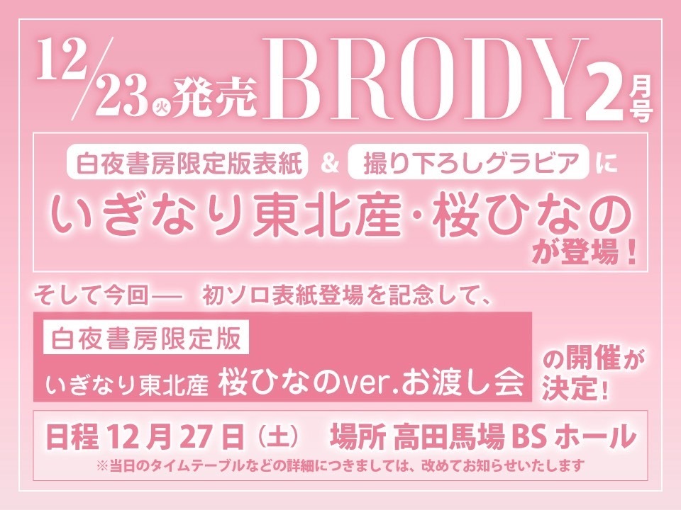 ご購入いただいた『BRODY 2月号』白夜書房限定版(いぎなり東北産桜ひなのver.)は、特典と合わせてイベント当日にその場でお渡しします!